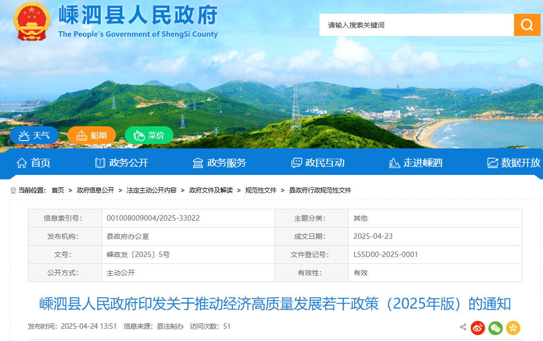 浙江省舟山市嵊泗县人民政府印发关于推动经济高质量生长若干政策(2025年版)